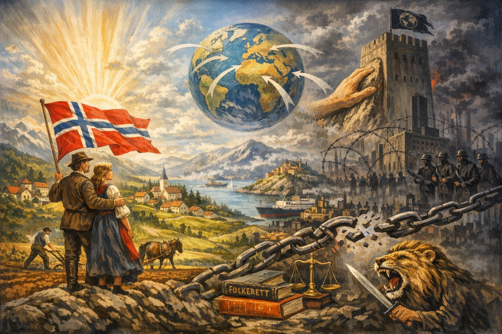 At det nasjonale instinktet er sterkt i den ytre politikken, det syner soga greidt nok; og det kjem nettupp tydeleg fram når det gjeld det millomfolkelege samarbeidet. I tider då lovløysa folk og folk imillom (land og land imillom) var stor og rettsuvissa tilsvarande, kunde det ikkje vera tala um millomfolkeleg samarbeid I nokon større mun. So lenge dei ymse folk ikkje godkjende retten til kvarandre å vera til, måtte nasjonal avstengjing vera høgste politiske grunnsetning. Underkuing av andre og avstengjing frå andre gjekk hand i hand og laut gå hand i hand. Med nasjonal avstengjing fylgde den tankegangen at folket var seg sjølv nok og at det var Guds utvalde folk; soleis veit me frå bibelsoga at jødane trudde det um seg at dei var Guds utvalde folk; og det same trudde hellenane um seg.